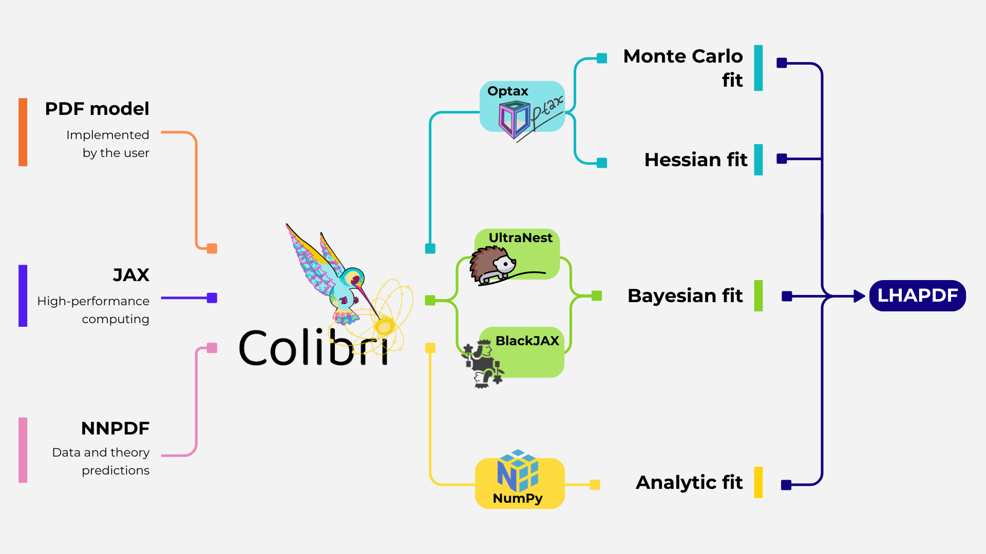 Colibri takes as input (i) a PDF model, which may be any arbitrary parametrisation implemented by the user, (ii) JAX, which provides high-performance array operations and native GPU support for fast computations, and (iii) data and theory predictions, which it inherits from the NNPDF framework. It then performs a fit using a given inference method, which is specified by the user. At the time of release, the options are a Monte Carlo, Bayesian or analytic fit. In each case, the result follows the LHAPDF format.